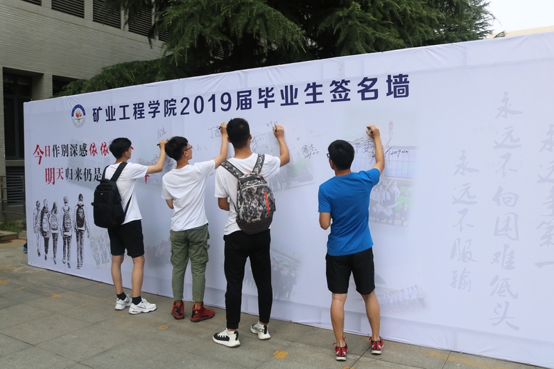 矿业楼前树立着毕业生签名墙,前来办理手续的毕业生们纷纷在签名墙前和昔日师长、同窗合影留念。