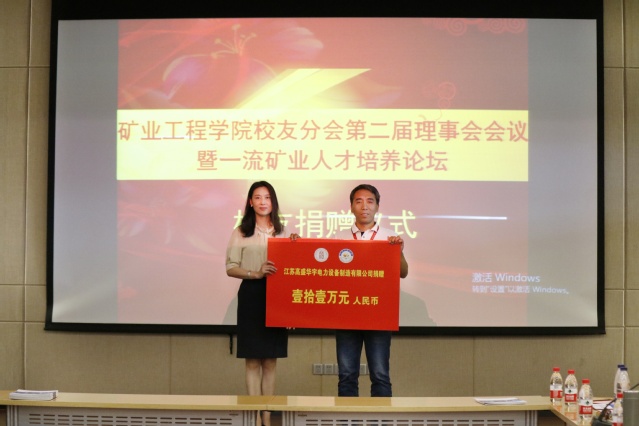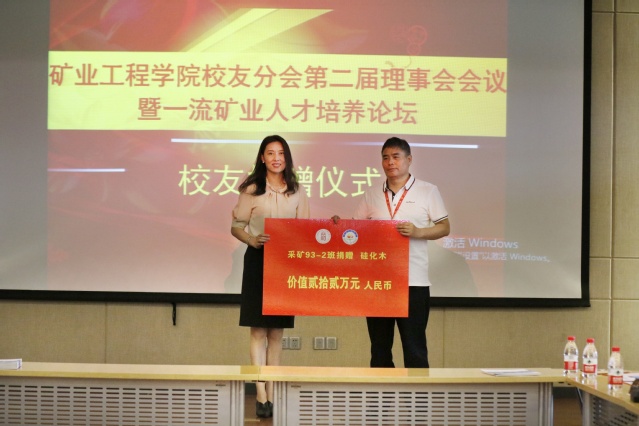 会上,举行了校友现场捐赠仪式,江苏高盛华宇电力设备有限公司董事长92级校友吕明俊、采矿93-2班校友代表上海大屯能源股份有限公司副总经理孙凯上台进行捐赠,行政副院长王晓琳代表学院接受了捐赠。