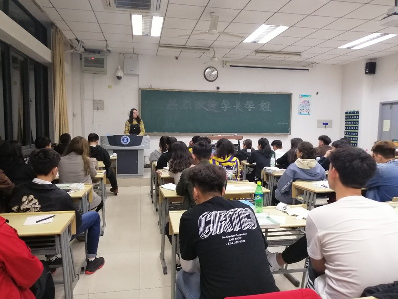随后的交流环节中,凯丽比努尔·阿卜力孜学姐和艾克热木江·艾合麦提学长分别上台分享自己的学习方法和经验,他们以生动的语言向学弟学妹讲述了自己立志学习的过程,告诉同学们在日常学习中如何合理地管理时间、培养良好的英语学习习惯。