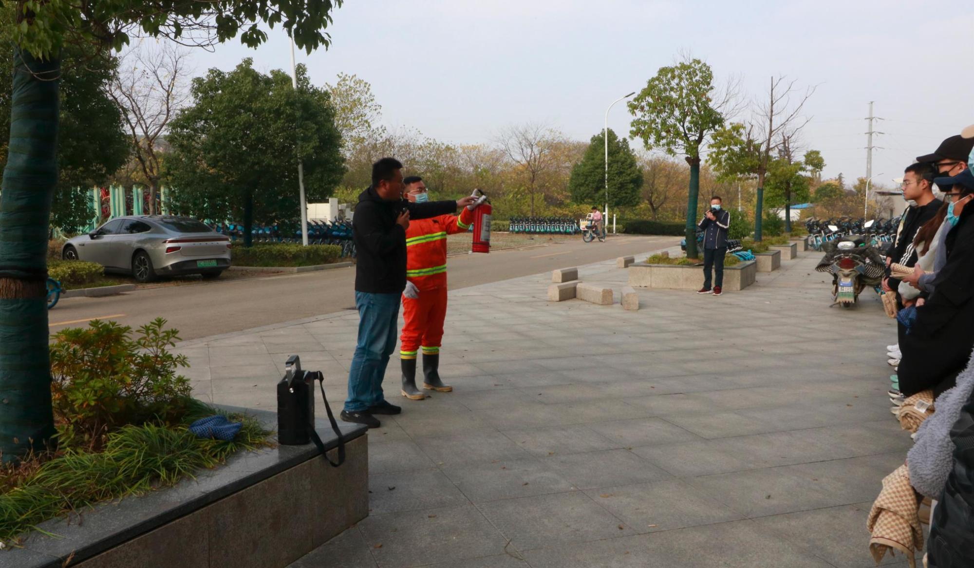 消防灭火演练前,保卫处王锐老师讲解了灭火器的使用原理及注意事项,并且演示了灭火器使用中的“提”、“拔”、“握”、“压”四个关键步骤和细节。随后,师生五人一组,使用灭火器对模拟火灾现场进行实际灭火操作,熟悉灭火器使用方法。