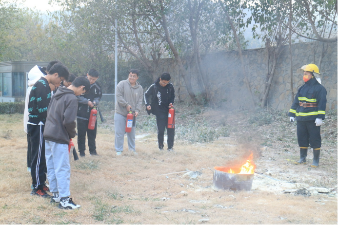本次消防演练分为两个环节。一是应急疏散逃生演练。保卫处工作人员在学院楼各个楼层模拟释放烟雾并拉响警报,学院应急疏散引导员按照制定的预案迅速组织师生疏散逃生。参演师生用湿毛巾捂住口、鼻,按照应急疏散指示标识和既定的应急疏散路线,有序地疏散到楼外安全区域。演练结束后,安全科科长瞿望对本次演练进行了讲评,并向师生科普了消防知识、逃生知识。二是消防灭火演练。保卫处王锐老师首先给大家详细介绍了干粉灭火器的功能和使用方法,讲解了“提、拔、握,压”的灭火器使用口诀。在灭火器实操环节中,在场师生以十人一组的方式进行分组演练,亲自操作灭火器,顺利完成了灭火任务。