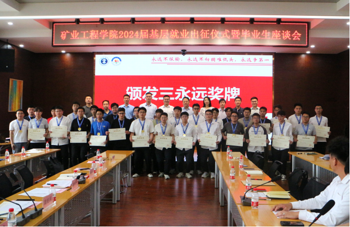 随后,学院领导为基层就业先进个人颁发“三永远奖牌”,表彰他们响应党和国家号召,接过能源强国的接力棒,扎根基层的热情和信念。这枚奖牌整体造型为时光年轮,祥云点缀,寓意此去繁华似锦,归来仍是少年。正面为学校地标建筑图书馆和镜湖,告诉大家要铭记母校和师长教诲,青春赛道奋力奔跑;背面为山峰造型,取意“世上无难事 只要肯登攀”,祝愿毕业生在“三永远”精神伴随下铸就精彩人生。