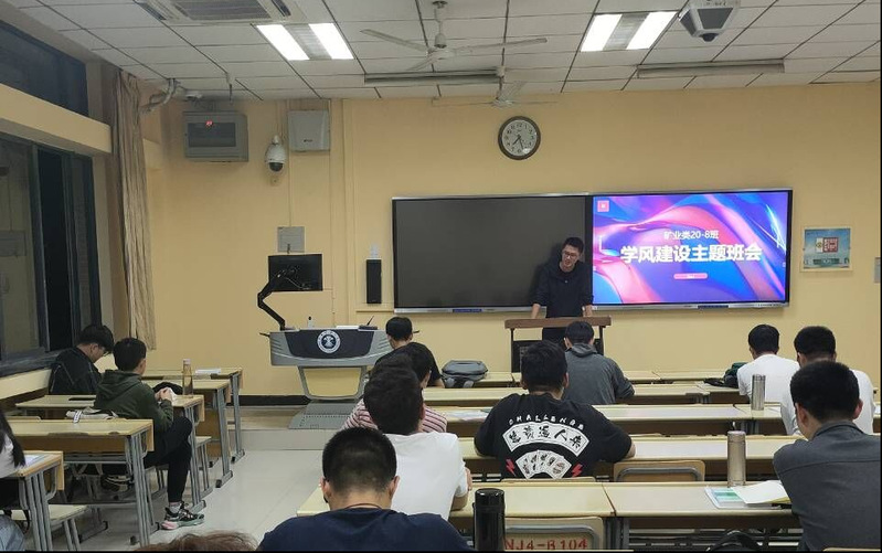 矿业类20级8班在博学楼4楼B102召开学风建设主题班会,班长王海龙主持会议,班级全体成员参与,为之后的班级学风建设规划做准备。