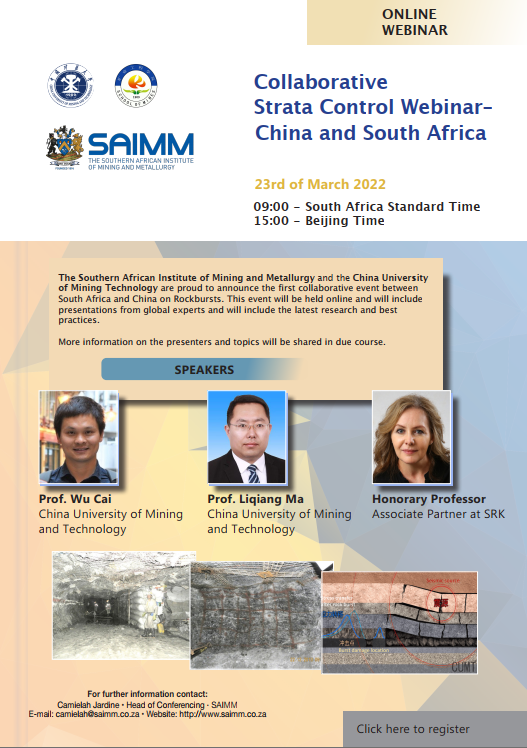 学术会议 欧美无码 - 学科动态 - 学术会议 - 正文 Collaborative Strata Control Webinar - China and South Africa 作者:办公室新闻发布浏览:时间:2022-03-23 ZOOM注册网址: 新闻来源:人才与学科工作办公室 摄影: 责任编辑:文涛 审核:马立强
