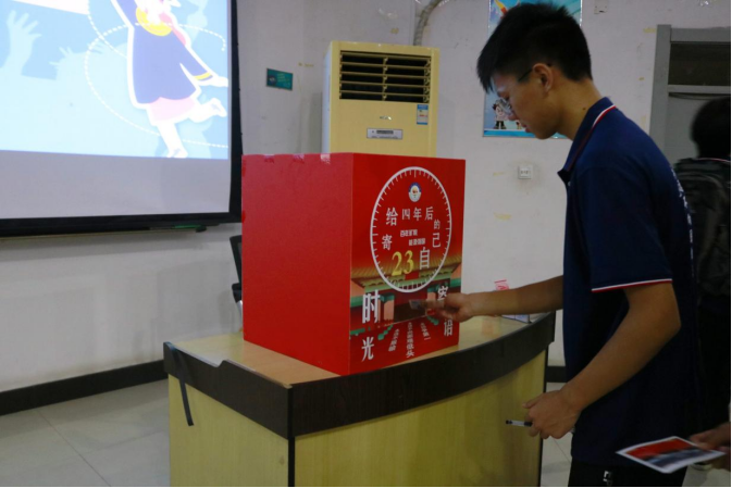 随后,田悦辰从学生手册、安全教育和日常管理三个方面展开讲解。他向新生介绍了学生手册上有关的重要规章制度和条例;就宿舍安全、交通安全实验室安全等多个方面对新生开展安全教育,提醒同学们要谨防电信诈骗等相关网络骗局;随后,他介绍了晨训、请假销假及晚签到制度等日常管理规范和注意事项。接着,田悦辰进行了军训动员,介绍了军训的相关注意事项,鼓励同学们积极参加相关军训项目比赛,不断地提升自己。会议最后进行了时光寄语环节,同学们在明信片上写下了对自己四年后的寄语,并亲手投入信箱。
