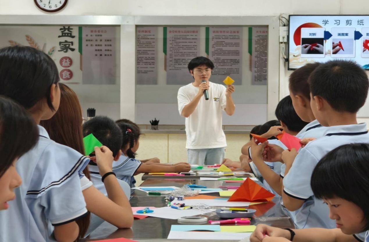 课程期间,支教团成员带领孩子们观看皮影戏《美猴王》,体验捏驴皮、提线操作,以实践开启非遗启蒙;组织孩子们参与丁烷燃烧实验,在观察与验证中点燃科学探索热情;下午开展“诗词里的四季”剪纸课,依《春晓》等古诗脉络,按照“对折定位、勾画半纹、精准剪裁”流程,引导孩子们将诗意融入剪纸创作,让传统文化借实践传承。此次活动通过多元实践形式,让孩子们在亲身体验中感受非遗与传统文化魅力,同步激发科学探索热情,有效实现了文化传承与科学启蒙的融合赋能。